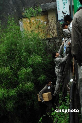 5月12日四川發(fā)生大地震后,臥龍保護區(qū)管理局的職工于第一時間將大熊貓轉(zhuǎn)移到安全地帶。臥龍保護區(qū)工作人員是這樣給熊貓運送食物。中新社發(fā) 臥龍人 攝