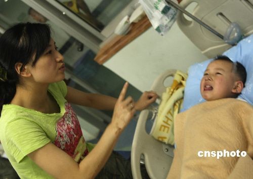 5月21日,在四川汶川5·12大地震中被救出后向解放軍“行隊(duì)禮”的北川3歲男孩郎錚在綿陽市解放軍某醫(yī)院成功完成斷臂續(xù)接手術(shù),精神面貌很好。圖為郎錚與媽媽吳曉紅進(jìn)行語言交流。中新社發(fā) 趙振清 攝