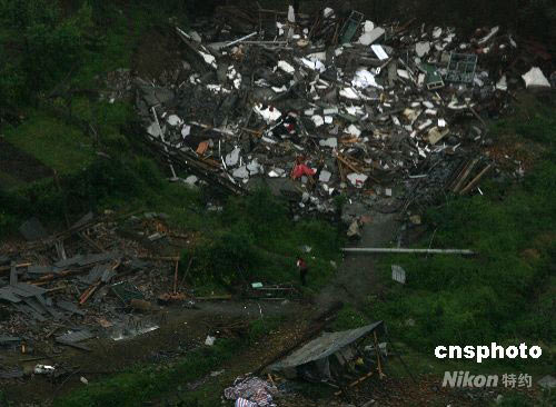 五月二十一日,汶川大地震第十天,從空中可見(jiàn)一位偏遠(yuǎn)山村的幸存者回到地震倒塌的家園,面對(duì)廢墟。中新社發(fā) 賈國(guó)榮 攝