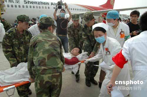 5月22日15時40分,深圳航空公司一架波音737飛機準時將38名四川災(zāi)區(qū)傷員運抵南寧國際機場。大批早已集結(jié)在此的醫(yī)護人員迅速將傷員轉(zhuǎn)運至南寧各大醫(yī)院。當天將有4架飛機共144名傷員運至南寧,這些在地震中經(jīng)歷了生死瞬間的四川同胞,將分別被安排在廣西醫(yī)科大學第一附屬醫(yī)院等四個醫(yī)院進行后續(xù)治療。中新社發(fā) 蔣雪林 攝