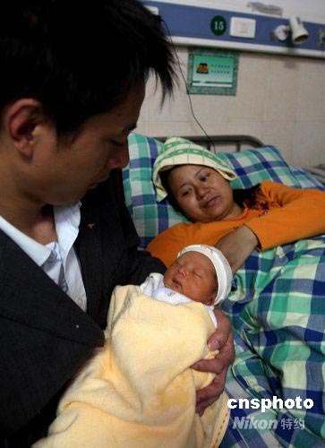 5月23日,李美川(右)和丈夫李應(yīng)剛在綿陽市第三人民醫(yī)院細(xì)心照顧小寶寶李虹升。5月17日,孕婦李美川被武警官兵從地震重災(zāi)區(qū)北川縣漩坪鎮(zhèn)護(hù)送出來后順利分娩,母子現(xiàn)在一切安好。中新社發(fā) 黃榮 攝