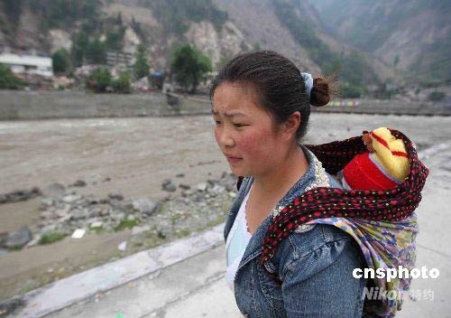 5月22日,23歲的唐先勇背著她不到3個(gè)月的孩子到汶川縣草坡鄉(xiāng)打探失蹤父母和爺爺奶奶的消息。中新社發(fā) 曾憲平 攝