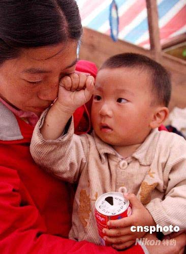 5月22日,在汶川縣映秀鎮(zhèn)災(zāi)民帳篷內(nèi)37歲的羅后芬為在汶川地震中失去的12歲大兒子王光杰而淚流滿面。不到兩歲的小兒子王光昊似乎看懂了媽媽的悲痛,不停地為媽媽擦拭眼淚。中新社發(fā) 曾憲平 攝