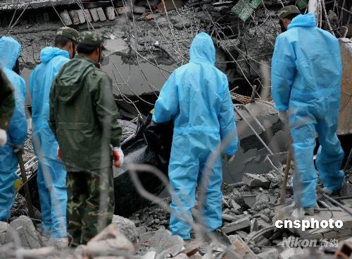 武警官兵五月中旬開始清理汶川大地震受災(zāi)嚴(yán)重的映秀鎮(zhèn),他們在漩口中學(xué)每一次挖掘出來遇難學(xué)生的遺體時,都沉痛默哀。中新社發(fā) 賈國榮 攝