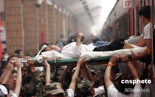 5月24日,運(yùn)載四川綿陽(yáng)到武漢漢口的264名地震災(zāi)區(qū)傷員轉(zhuǎn)運(yùn)專列到達(dá)漢口站。他們將在協(xié)和、同濟(jì)、陸軍總醫(yī)院、人民醫(yī)院等醫(yī)院接受治療。中新社發(fā) 攝記 攝
