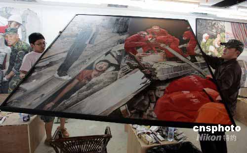 5月25日,參加嘉德義賣的油畫家在北京加緊創(chuàng)作以汶川大地震為主題的巨作。中國(guó)嘉德國(guó)際拍賣有限公司將于5月27日在北京為四川地震災(zāi)區(qū)舉行義拍活動(dòng)。在眾多拍品中,一幅由30位名家集體創(chuàng)作的,2米高、20多米長(zhǎng)的抗震救災(zāi)主題油畫成為最大熱點(diǎn),該油畫由寫實(shí)畫派名家艾軒、楊飛云、王沂東領(lǐng)銜創(chuàng)作,以巨幅作品的形式表現(xiàn)全國(guó)人民眾志成城、奮力抗災(zāi)的感天動(dòng)地的悲壯情景。中新社發(fā) 楊可佳 攝