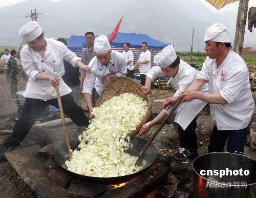 2008年5月25日下午6時(shí),四川彭州市小魚洞鎮(zhèn)大南村田地上,來自北京的大廚們?cè)跒楫?dāng)?shù)卮迕褡觥百c災(zāi)飯”。24日開始,北京美食聯(lián)盟組織北京全聚德、大鴨梨、便宜坊等大飯店的105名廚師,籌集200萬元資金在災(zāi)區(qū)分設(shè)3個(gè)賑災(zāi)點(diǎn),免費(fèi)為災(zāi)區(qū)群眾供應(yīng)飯菜。中新社發(fā) 張曉理 攝
