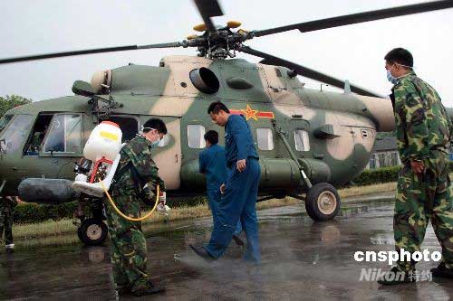 圖:震區(qū)中國(guó)空軍為飛行員和飛機(jī)消毒