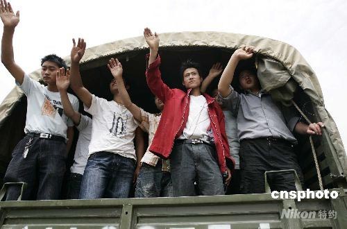 5月28日,四川平武縣南壩鎮(zhèn)19名受災青年集體前往沈陽打工謀生自救,在搭乘軍車離開時,揮手告別家鄉(xiāng)。平武縣在5. 12地震中損失慘重,25個鄉(xiāng)鎮(zhèn)18.6萬人全部受災90%以上房屋全部倒塌,截止27日16時,該縣3014人死亡,3555人失蹤。中新社發(fā) 杜洋 攝