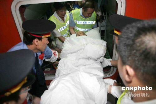 5月28日,首批91位四川災(zāi)區(qū)傷員抵達北京接受治療,這批傷員分別來自地震災(zāi)區(qū)的綿陽和德陽,其中15歲以下的12人,70歲以上的3人。傷員病情基本穩(wěn)定,傷情主要為四肢骨折等肢體外傷。傷員乘專列從綿陽火車站抵達北京,到京后他們被送往北京老年醫(yī)院治療。中新社發(fā) 富田 攝