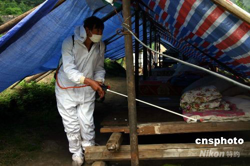 5月28日,為了防止大災之后出現(xiàn)大疫,衛(wèi)生防疫已進入地震災區(qū)家家戶戶。圖為防疫人員在汶川大地震重災區(qū)之一的彭州白鹿鎮(zhèn)噴灑消毒藥劑。中新社發(fā) 楊杰 攝