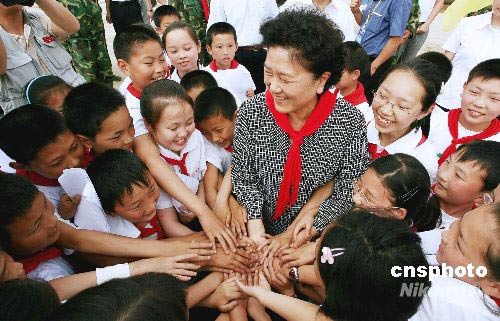 5月30日,中共中央政治局委員、國(guó)務(wù)委員劉延?xùn)|來(lái)到四川災(zāi)區(qū),與來(lái)自北川的學(xué)生在綿陽(yáng)八一帳篷學(xué)校共慶“六一”兒童節(jié)。中新社發(fā) 蒲滔 攝