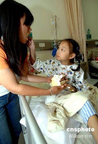 六月一日,福建省立醫(yī)院愛(ài)心病房,經(jīng)過(guò)兩次截肢的四川地震災(zāi)區(qū)受傷小女孩楊芹正在給媽媽喂蛋糕。在“5.12”汶川大地震中,楊芹的右腿被水泥板壓了近20個(gè)小時(shí),右大腿以下部分嚴(yán)重骨折、感染,神經(jīng)、肌肉等組織大量壞死,在一周之內(nèi)做了兩次截肢手術(shù),失去整條右腿。她后來(lái)被轉(zhuǎn)到福建省立醫(yī)院愛(ài)心病房接受治療。中新社發(fā) 王東明 攝