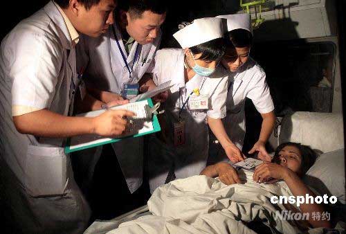 六月一日晚十一時(shí)許,四十位四川地震傷員轉(zhuǎn)移抵達(dá)福建泉州,分乘救護(hù)車前往泉州四家醫(yī)院接受救治。在救護(hù)車上,交接醫(yī)生第一時(shí)間了解病人情況并做出移動(dòng)方案。中新社發(fā) 傅丹丹 攝