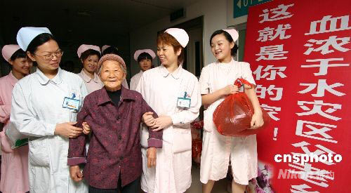 6月4日,醫(yī)務人員攙扶著災區(qū)百歲老人杜銀珍出院。當日,在重慶市第二人民醫(yī)院醫(yī)治的四川地震災區(qū)北川縣曲山鎮(zhèn)井夾山村的百歲老人杜銀珍痊愈出院,在醫(yī)務人員和民政局等部門工作人員的歡送下,由專人專車護送踏上回家的路程。據了解,四川地震災區(qū)在永川各家醫(yī)院醫(yī)治的95名傷員,部分全愈人員已返回家鄉(xiāng)。永川區(qū)還為每位出院人員發(fā)放車旅費和生活費700元。中新社發(fā) 陳仕川 攝