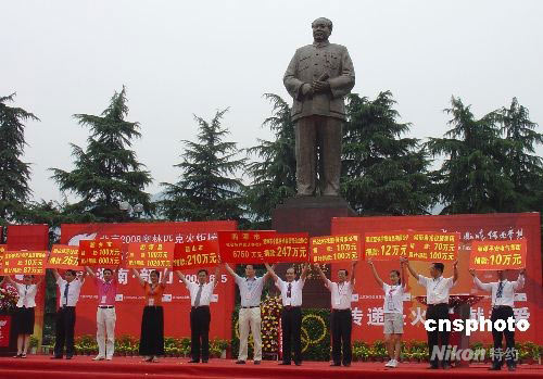 6月5日,奧運(yùn)圣火湘潭、韶山傳遞結(jié)束儀式在韶山毛澤東銅像廣場舉行,韶山各界向四川汶川地震災(zāi)區(qū)捐款。中新社發(fā) 肖前輝 攝