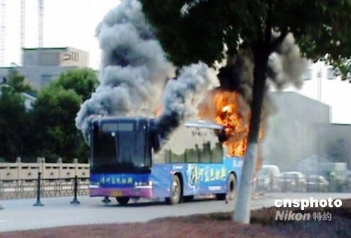 2008年7月6日下午16點(diǎn)58分,蘇州市一輛公交車在盤(pán)門(mén)路上行駛時(shí)突然發(fā)生自燃,蘇州消防特勤二中隊(duì)接警后迅速趕到現(xiàn)場(chǎng)將大火撲滅。據(jù)悉,該公交車自燃時(shí)車上乘客已全部安全下車,事故未造成人員傷亡。中新社發(fā) 朱子寒 攝