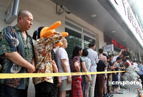 7月9日,北京,眾多市民在銀行門前排隊(duì)等候兌換奧運(yùn)紀(jì)念鈔。由央行發(fā)行的600萬張10元面額奧運(yùn)紀(jì)念鈔,9日與北京市民見面。北京市工商銀行、農(nóng)業(yè)銀行、中國銀行、建設(shè)銀行、交通銀行5家商業(yè)銀行約300個(gè)營業(yè)網(wǎng)點(diǎn)面向社會(huì)兌換紀(jì)念鈔,規(guī)定每人僅限兌換一張。許多市民甚至連夜排隊(duì)等候。中新社發(fā) 盛佳鵬 攝