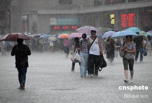 7月18日,游客冒雨行走在北京火車站廣場。當(dāng)日,北京遭遇強(qiáng)降雨,在雷聲轟鳴中,一場大雨傾盆而下,很多市民和游客猝不及防。中新社發(fā) 耿玉和 攝