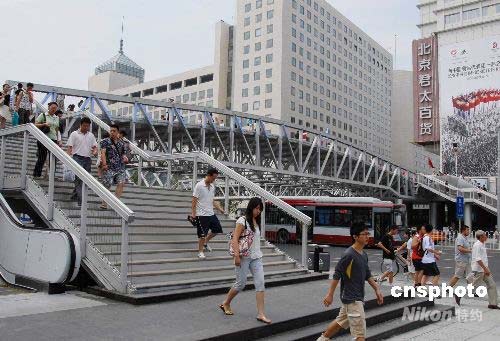 2008年7月20日,行人通過北京西單天橋。當(dāng)天,經(jīng)過改建、新建后的北京西單商業(yè)街區(qū)天橋正式投入使用。西單商業(yè)街改造工程共建新橋兩座、一個連廊,改建舊橋兩座。其中新1號橋是目前世界上最大的高強(qiáng)度全鋁合金天橋,主橋長84米,寬8米,兩側(cè)四個方向共8部上行電動扶梯,照明系統(tǒng)采用了先進(jìn)的LED燈,美觀、節(jié)能、環(huán)保。中新社發(fā) 耿玉和 攝