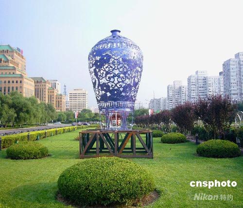7月20日,一個高4米左右的“青花瓷”瓶奧運花壇在北京長安街亮相,其清新典雅的“芳姿”成為一道別致風(fēng)景。中新社發(fā) 玉龍 攝