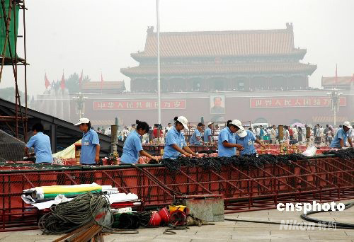 7月24日,北京天安門廣場中心花壇主景周圍擺放圓形花壇,并在花壇外圍布置低噴泉和彌霧裝置。整個廣場花壇都采用了夜景照明設(shè)計,達(dá)到白天看花,晚上看燈的效果。現(xiàn)在整個工程正在緊張進(jìn)行,預(yù)計將于26日完工。中新社發(fā) 張雙雙 攝
