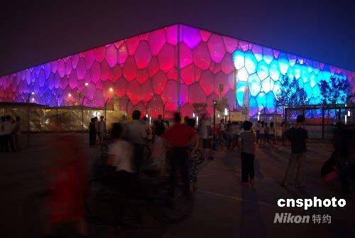 7月25日,隨著北京奧運(yùn)會的臨近,奧運(yùn)場館“水立方”五顏六色的彩燈在夜色中交相輝映,變幻萬千,令北京的夜晚愈加迷人。中新社發(fā) 九州 攝