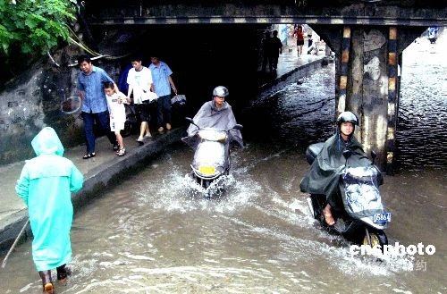 7月29日,受臺(tái)風(fēng)“鳳凰”帶來強(qiáng)降雨的影響,福州一低洼地帶積水仍未退去,為市民出行帶來不便。中新社發(fā) 劉可耕 攝