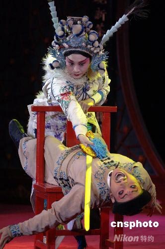 8月3日晚,北京老舍茶館推出一臺(tái)新編主題文化演出劇目《四季北京.茶》,以中國(guó)茶文化為主線,以特點(diǎn)鮮明的北京四季變化為舞臺(tái)背景,并借助多媒體影像等高科技手段,吸引眾多海內(nèi)外游客觀看。圖為精彩的京劇表演。中新社發(fā) 王東明 攝