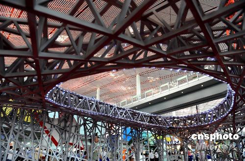圖:首都機(jī)場(chǎng)搭建“鳥(niǎo)巢”歡迎奧運(yùn)賓朋