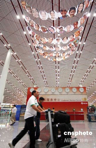 圖:首都機(jī)場(chǎng)綻"笑臉"鳴"缶樂(lè)"送別奧運(yùn)客