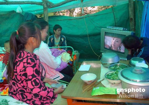 9月1日,經(jīng)過兩天的緊急救援,大批救援物資陸續(xù)到達四川省攀枝花地震災區(qū)。經(jīng)過相關(guān)部門緊張搶修,災區(qū)通訊、電力等基礎設施也正在逐步恢復中。圖為攀枝花市順利村幾名兒童圍坐在防震棚中觀看電視節(jié)目。中新社發(fā) 劉子倩 攝