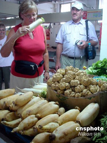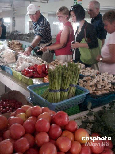 2008年9月1日,外國游人在蘇州雙塔菜場游覽。如今到蘇州旅游的外國游人越來越多,他們在游覽古典園林的同時(shí),蘇州的菜市場也成為“老外”游客游覽的新景點(diǎn)。市場內(nèi)豐富的農(nóng)產(chǎn)品和當(dāng)?shù)匕傩丈钗恕袄贤狻眰兊哪抗。中新社發(fā) 王建康 攝