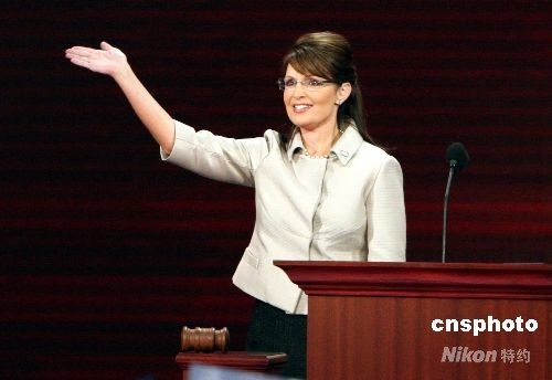 美國(guó)阿拉斯加州州長(zhǎng)薩拉·佩林,九月三日在明尼蘇達(dá)州州府圣保羅舉行的共和黨全國(guó)代表大會(huì)上發(fā)表接受提名演說(shuō),成為共和黨歷史上首位女副總統(tǒng)候選人。中新社發(fā) 李靜 攝