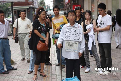 9月9日,一名特別的“乞丐”在哈爾濱市南崗區(qū)果戈里大街乞討。記者了解到,“乞丐”名叫夏海波,1982年9月15日出生,高二時因病輟學(xué),治病花光了家里的錢,但是病還是沒有醫(yī)治好。2006年他離開家鄉(xiāng),試圖找份工作養(yǎng)活自己,但因為自身殘疾沒有找到合適的工作。生活使他走上街頭,試圖靠乞討的錢治病延緩病情發(fā)展。夏海波開了博客,將每天的感受記錄在博客里。他在博客里公開了自己的銀行帳號,以便接受網(wǎng)友的捐助。中新社發(fā) 王忠言 攝
