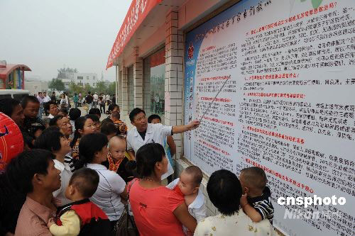 9月20日,六安市人民醫(yī)院的專家在向家長介紹奶粉導致泌尿系統(tǒng)結(jié)石的原因及篩查治療辦法。當日,安徽六安市食用含三聚氰胺奶粉嬰幼兒篩查和救治工作全面展開,全市確定11家定點收治和132家篩查醫(yī)院,免費為食用“問題奶粉”的嬰幼兒篩查治療。中新社發(fā) 陳超平 攝