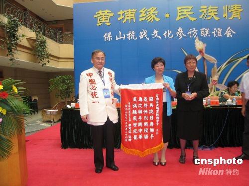 圖為臺灣中華新黨主席樂可銘(左一)向云南省黃埔軍校同學(xué)會秘書長李俊平(左二)贈送錦旗。