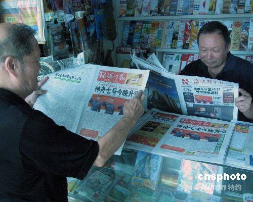 9月25日,福州市民通過閱讀國內(nèi)多家報紙在頭版刊登“神七”飛船于當日晚間擇機發(fā)射的消息,關(guān)注3位“神七”航天員。中新社發(fā) 劉可耕 攝