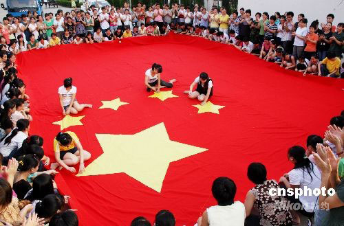 9月27日下午,隸屬于江西省上饒經(jīng)濟開發(fā)區(qū)的臺資企業(yè)江西宏福服裝公司廠區(qū)內(nèi),幾百名縫紉女工匯集一起,共同縫制了一幅長10米、寬7米的巨型五星紅旗,并以此來慶祝祖國59華誕和神七順利飛天,表達出他們熱愛祖國的心情。中新社發(fā) 卓忠偉 攝