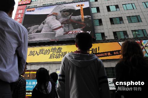 9月27日下午,北京王府井大街,正在直播神七航天員出艙活動(dòng)的大屏幕吸引眾人目光,駐足觀看民眾不時(shí)為航天員圓滿完成任務(wù)歡呼。中新社發(fā) 廖攀 攝