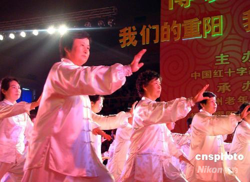10月6日,揚州150位老人同臺表演太極拳。當天,由中國紅十字基金會主辦的“博愛中國•我們的重陽”大聯(lián)歡活動在江蘇揚州市體育場舉行,近千名老年朋友歡聚一堂,表演并觀看精彩紛呈的文藝演出,喜迎重陽節(jié)。 中新社發(fā) 陳中秋 攝