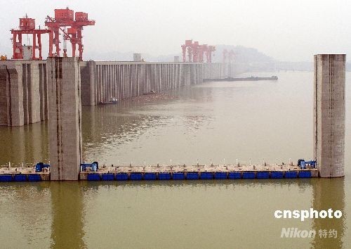 2008年10月7日,經(jīng)過近10天持續(xù)不斷地蓄水,三峽工程大壩壩前水位達(dá)到155.5米,并保持在該水位以上運(yùn)行,實(shí)現(xiàn)了2008年汛后先期蓄水至156米水位的目標(biāo),是否向175米水位抬升尚需再檢測并研究三峽大壩運(yùn)行情況、三峽庫區(qū)地質(zhì)災(zāi)害狀況等之后再做決定。按設(shè)計(jì)要求,三峽工程分135米、156米、175米三個(gè)水位進(jìn)行蓄水。此前,三峽工程已于2006年、2007年兩次蓄至156米水位高程。中新社發(fā) 劉君鳳 攝