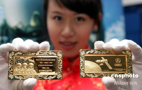 10月9日,為紀(jì)念神舟七號成功發(fā)射和中國首次太空行走圓滿成功,作為國家紀(jì)念 “神七”飛天活動的重要組成部分,中國航天部門首次面向全球發(fā)行“金鑲鉆神七金條”!敖痂傘@神七金條”分45克、90克、300克和1000克四種規(guī)格,全部采用999純黃金制作,正面的主體圖案為三位宇航員肖像,背面為神七飛船和宇航員出艙行走的風(fēng)姿,這在中國航天史上尚屬首次。中新社發(fā) 趙雋 攝