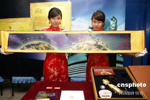 圖為工作人員展示為配合“神七”紀(jì)念金條發(fā)行的一幅1.6米神舟七號載人航天飛行紀(jì)念純金藏卷。