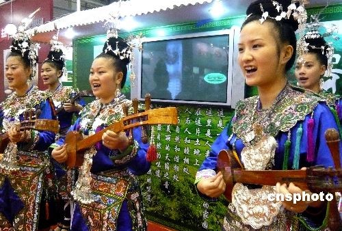 10月13日,正在北京舉行的第五屆中國國際茶業(yè)博覽會(簡稱第五屆茶博會)吸引眾多商家和參觀者,是次由中國商務部外貿(mào)發(fā)展局、中國土產(chǎn)畜產(chǎn)進出口總公司聯(lián)合主辦的茶博會推出中國茶樣大巡展"活動、"有機"名優(yōu)茶評選、世界茶文明之旅以及豐富多采的茶藝表演大賽暨"世界茶文明之旅---中華茶藝之星"選拔大賽。圖為在茶博會上來自中國貴州參展團的少數(shù)民族茶藝文化表演隊為參觀者表演當?shù)孛褡甯栉。中新社發(fā) 錢興強 攝