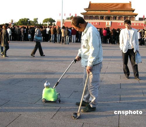 2008年10月26日,一種專門(mén)清理口香糖的袖珍電動(dòng)清潔機(jī)亮相北京天安門(mén)廣場(chǎng)。圖為環(huán)衛(wèi)工人使用它清洗大理石上的口香糖。中新社發(fā) 玉龍 攝