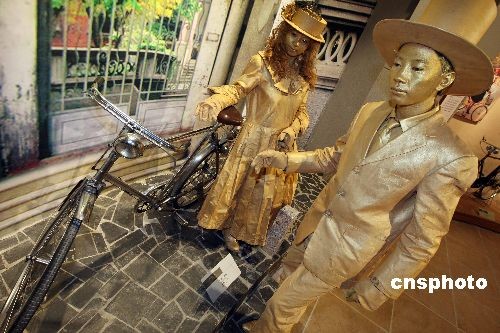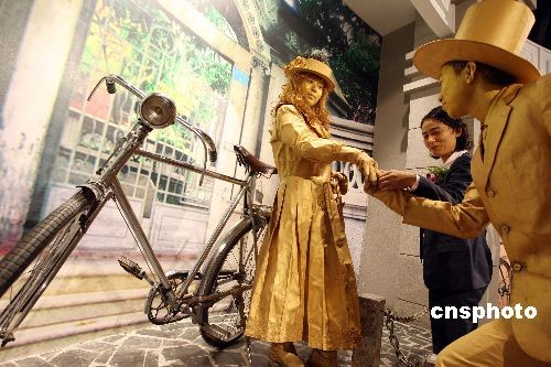 10月28日,行為藝術(shù)者在河北省霸州市新落成的華夏民間收藏館自行車(chē)博物館內(nèi)表演,表演者倚靠的是著名民間收藏家王明璽老人收藏的1910年英國(guó)生產(chǎn)的白金人牌自行車(chē)。該車(chē)只生產(chǎn)了100輛,進(jìn)入中國(guó)10輛,這是目前發(fā)現(xiàn)保存最為完好的一輛。當(dāng)日,第二屆霸州文化藝術(shù)節(jié)在河北省霸州市隆重開(kāi)幕。中新社發(fā) 毛建軍 攝