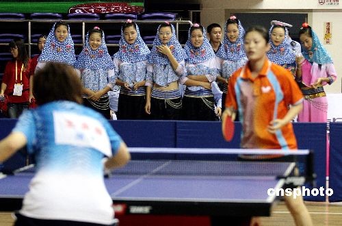10月31日,在福建泉州舉行的第六屆全國農(nóng)運會乒乓球男子、女子單打比賽上,身著傳統(tǒng)服飾的惠安女在現(xiàn)場為選手加油助威。中新社發(fā) 傅丹丹 攝