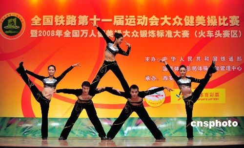 11月2日,全國(guó)鐵路第十一屆運(yùn)動(dòng)會(huì)大眾健美操賽在西安開(kāi)賽,17支代表隊(duì)的173名選手參加了職工大眾組和中年組7個(gè)級(jí)別的比賽。圖為參賽選手在大眾健美操比賽中。中新社發(fā) 唐振江 攝