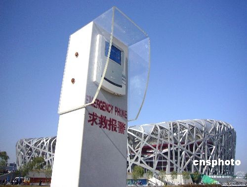 2008年11月2日,北京國(guó)家體育場(chǎng)“鳥巢”四周設(shè)立了求救報(bào)警器,確保中外游客在遇到突發(fā)情況時(shí)迅速報(bào)警,全方位的保障奧運(yùn)中心區(qū)游客的人身安全。 中新社發(fā) 玉龍 攝